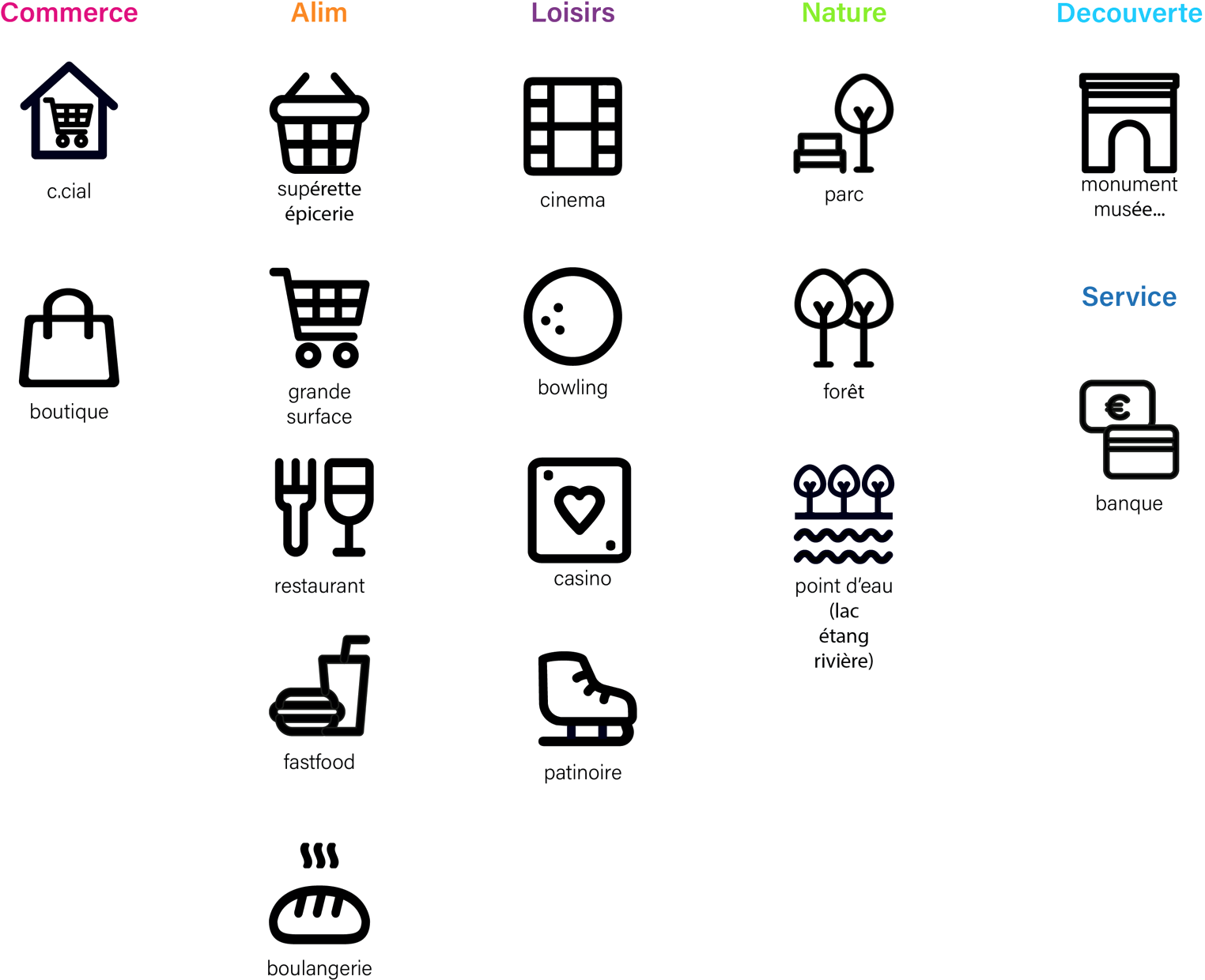 Les lieux de proximité ont été regroupés en sept familles : loisirs, alimentaire, extérieur/nature, découverte, services, santé et commercial.