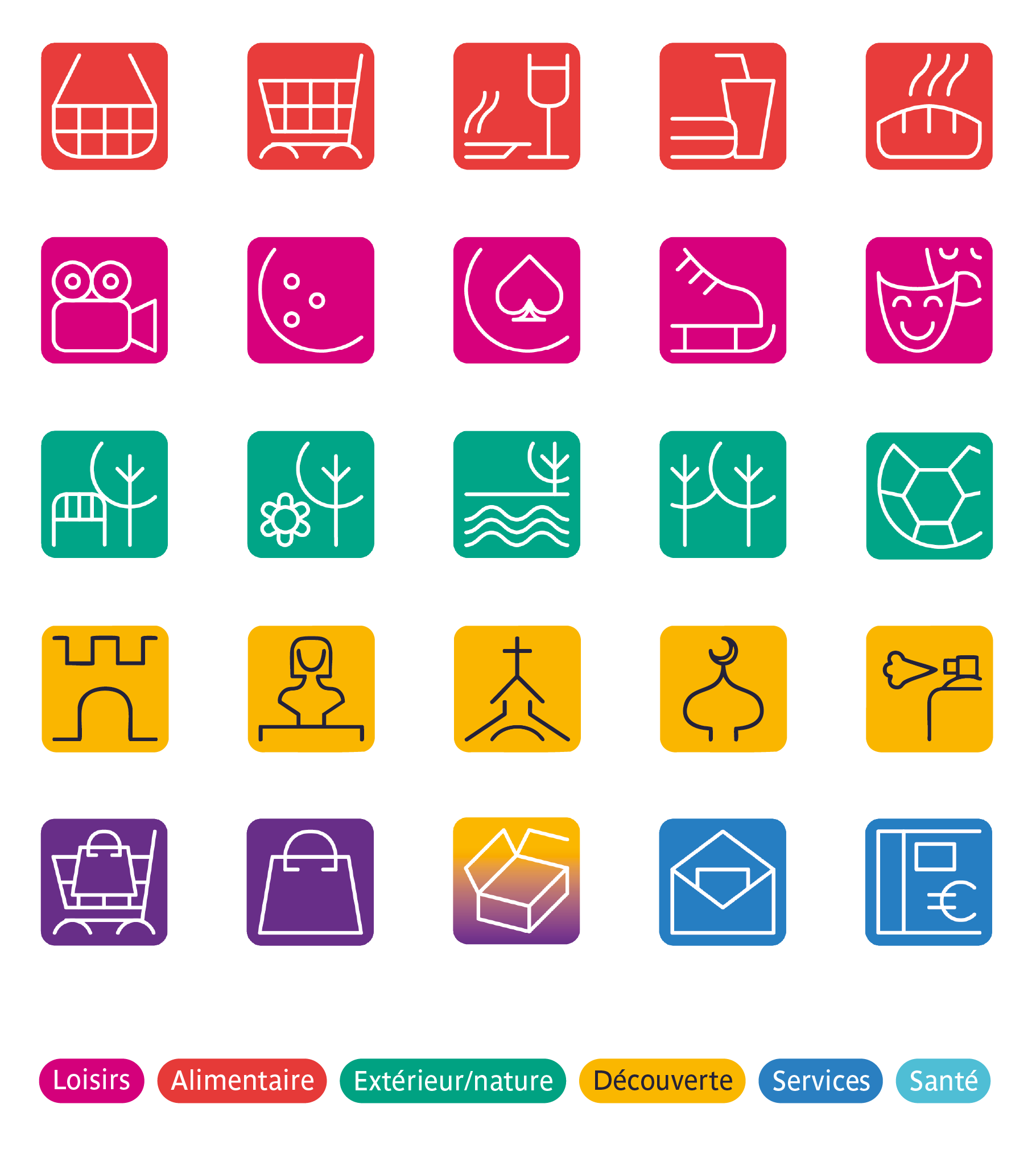 Chaque catégorie est représentée par un logo dont le système graphique, simple et cohérent, permet d’ajouter facilement de nouveaux pictogrammes. Ce qui garantit la pérennité et l’évolutivité du dispositif.