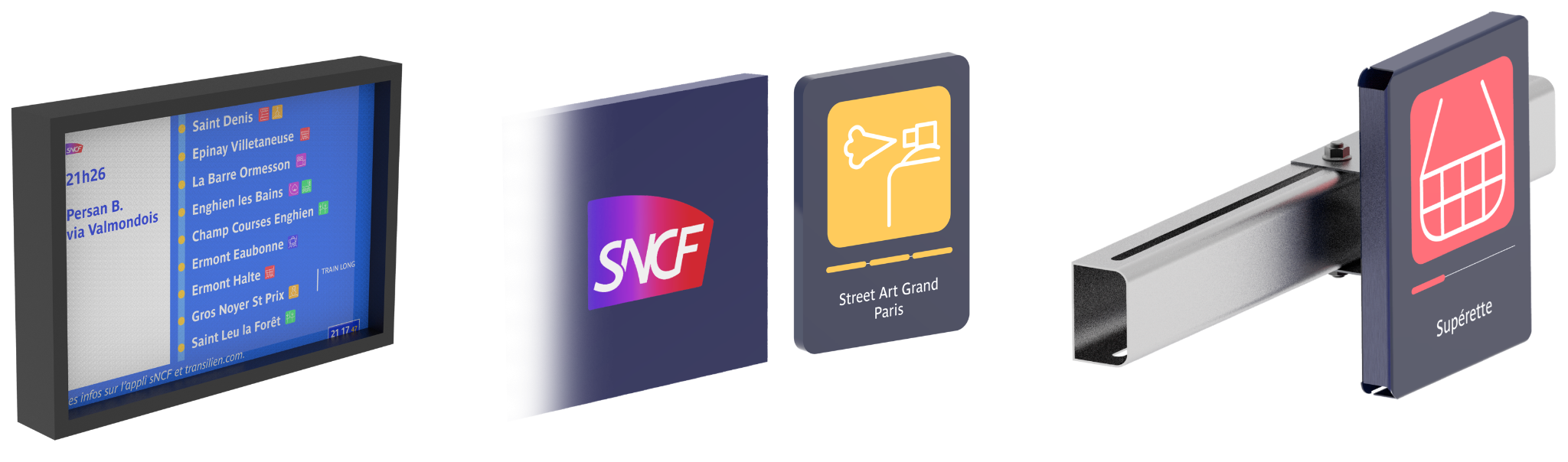 Les dispositifs proposés sont pensés comme modulables, pouvant être installés ou retirés selon l’ouverture et la fermeture des commerces ou services de proximité. Ainsi, du quai jusqu’au quartier, les usagers sont accompagnés en continu par une signalétique claire, cohérente et vivante, qui rend le parcours plus fluide et intuitif.