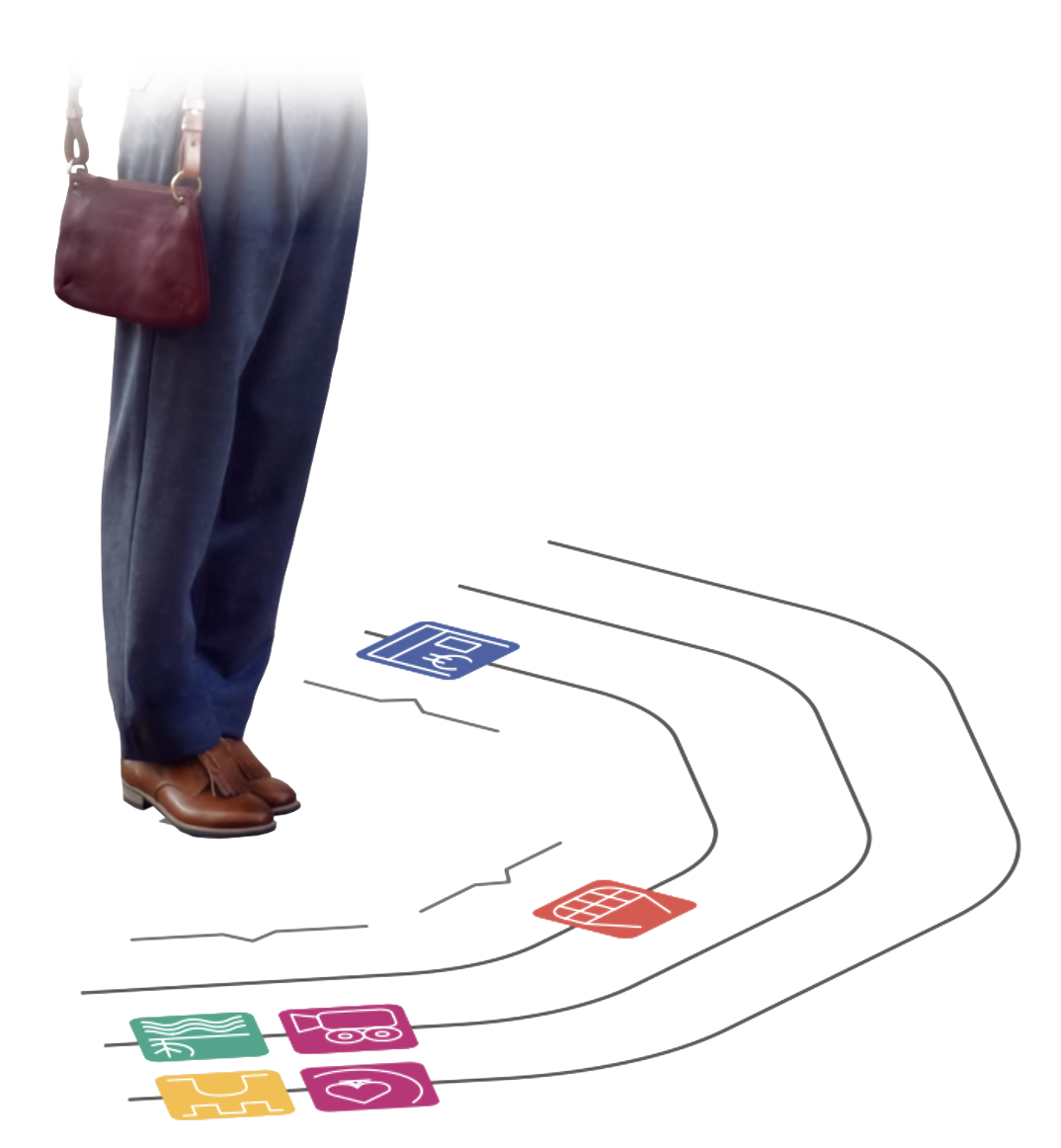 L’ambition était de libérer les piétons de la dépendance au portable pendant leur trajet. Pour cela, les activités sont signalées à différents points de contact : sur les écrans, aux sorties, sur le sol et, de manière ponctuelle, sur les poteaux de voirie.
