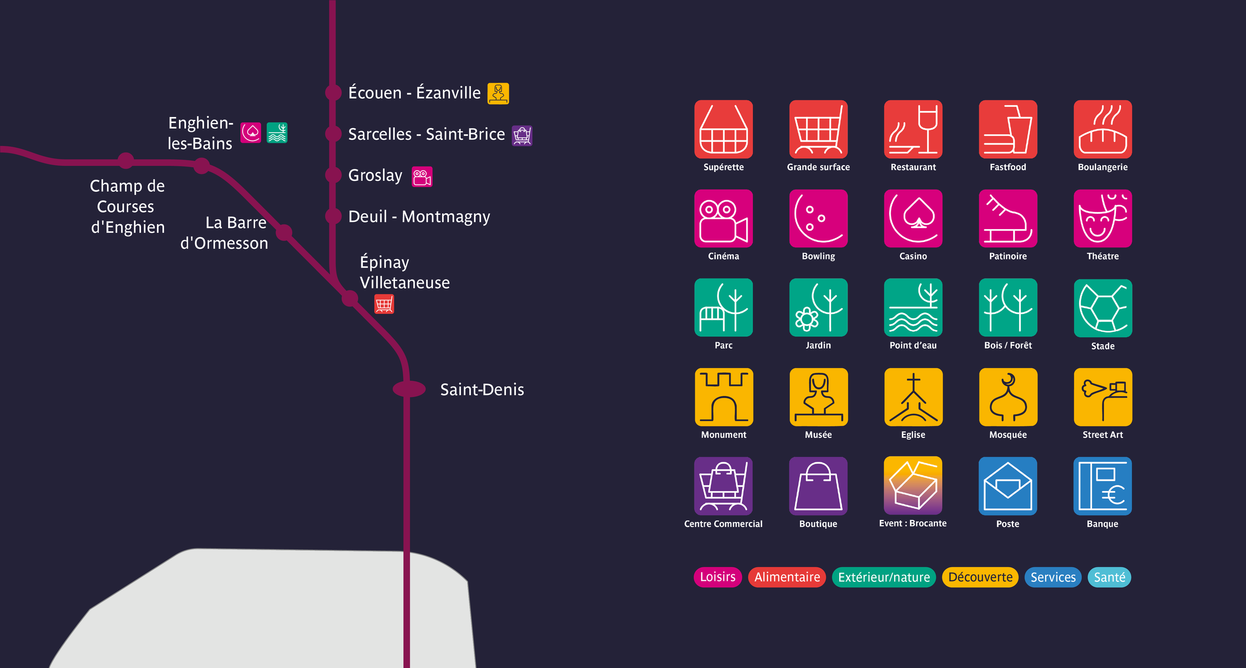 Pour ce projet mon but sera alors de trouver un moyen d'indiquer 6 grandes catégories d'activités de proximités autour d'une gare à travers un dispositif digital et signalétique.